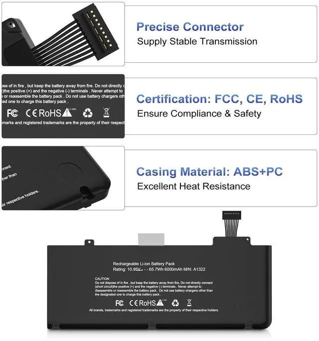 Voltage: 10.95V, Capacity: 65.7W h, 100% brand new from manufacture. ^^ Compatible Laptop ModelsA1322 A1278 Battery For MacBook Pro 13 inch Mid 2012, Late 2011, Early 2011, Mid2010, Mid 2009. ^^ Grade A cells ensure fast charges and low power consumption.