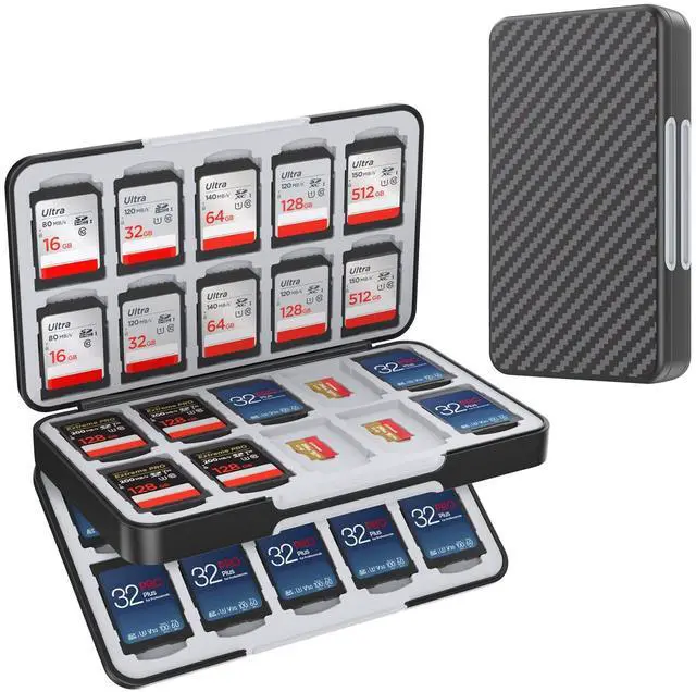LARGE CAPACITYThis sd card holder can store 40 SD SDHC SDXC Cards & 40 Micro SD Cards to meet your daily memory cards storage needs. ^^ FULL PROTECTIONMade of ABS plastic and soft silicone lining, the sd card case can effectively protect the card from impact. ^^ MAGNETIC CLASPSBuilt-in magnetic clasp design makes the sd card holder case easier to open and access. ^^ PORTABLE DESIGNThe micro sd card holder case storage is lightweight and small size, you can easily put it in your backpack for easy portability.