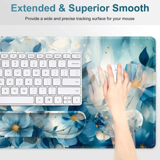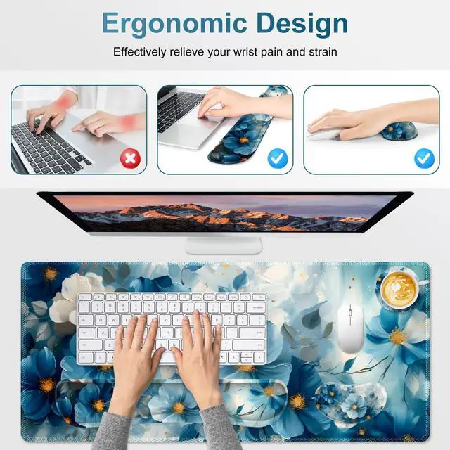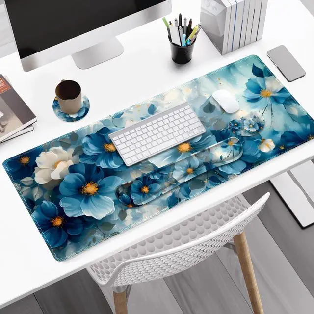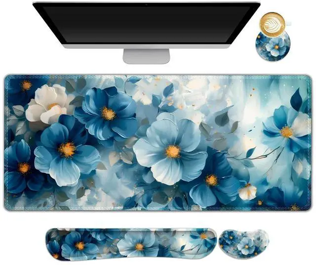 NXZGO Desk Mat Pad, Gaming Mouse Pad Wrist Support Set, 4 in1 Non-Slip Large Mousepad + Ergonomic Design Keyboard Wrist Rest+Mouse Wrist Rest+Coaster for Home Office Computer I Blue Floral Watercolor