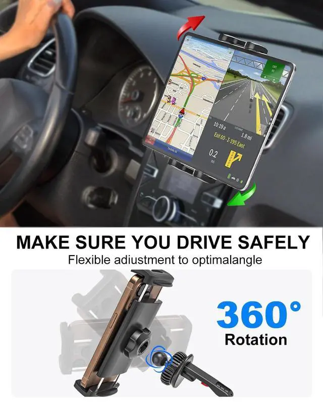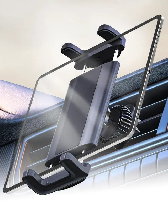 This ipad mini car mount It is also equipped with an auxiliary hook clip to share the weight and provide double locking protection for the vent, Never Fall Off. ^^ Easy to Adjust & Multiple Viewing AngleThis car air vent mount has a highly flexible ball-joint 360rotation that provides infinite viewing angles. This car vent phone mount allows quick switching between vertically and landscape view. Position your phone at the perfect angle, relieve driving fatigue, and it won't block your view of the road to enjoy a more relaxed and safer drive ^^ Hook the Vent StablyThis Vent Tablet Mount for Car suitable for most cars, pick-up trucks, SUVs, taxis, Trucks, Work trucks.