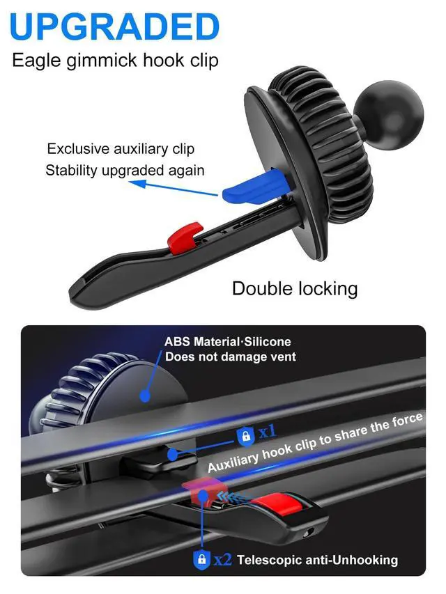 High-Quality Materials & Perfect ProtectionThis Universal car vent tablet mount Made from the latest high quality materials, It completely solves the problem that metal hooks on the market are easy to scratch and other cheap plastics are fragile, so that your car will not be damaged. Warm TipsThe width between the blades of the air outlet is not less than 0.43 inch/11mm [The bracket can be inserted at an angle]. ^^ Double lockingThis mount for car vent comes Adopts the latest upgraded eagle gimmick hook clip design, When installed the hook and the vent form a four-point double triangle mechanical support.
