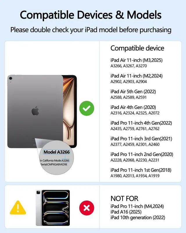 Models: A3266 / A3267 / A3270 / A2902 / A2903 / A2904 / A2588 / A2589 / A2591 / A2316 / A2324 / A2325 / A2072 / A2759 / A2761 / A2435 / A2762 / A2377 / A2459 / A2301 / A2460 / A2228 / A2068 / A2230 / A2231 / A1980 / A2013 / A1934 / A1979 Please double confirm your tablet model carefully before order.