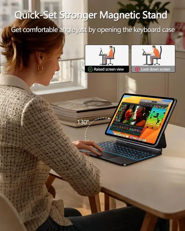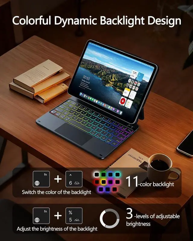 ^^ Dynamic Colorful Backlight - The magic keyboard for iPad Air/Pro come with 11-color soft backlit and 3-level brightness for typing easily and smoothly even in the dark of night. Built-in 500mAh rechargeable long-lasting battery allows you working continuously up to 300 hours on a single charge 2.5 -3 hours (No backlight). ^^ Compatibility - This ultra-slim keyboard case only perfectly compatible with iPad Air 11 inch(M3/2025, M2/2024), iPad Pro 11 inch(4th/3rd/2nd/1st Gen), iPad Air 10.9 inch(5th/4th Gen) All of