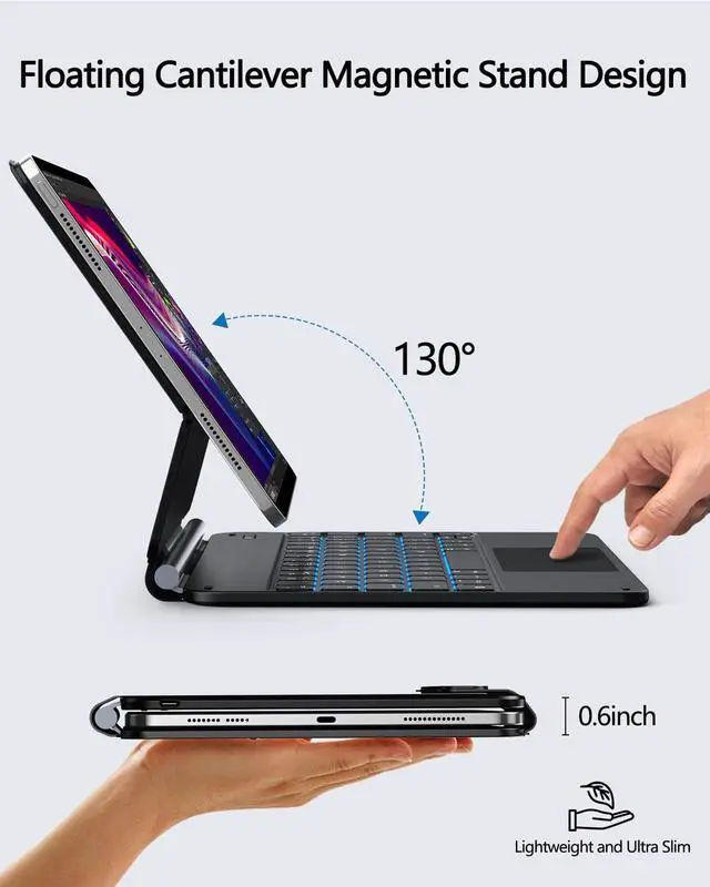 Laptop-Like Typing - Well-spaced keyboard containing a full row of shortcut keys provide on-tap access to quickly navigate and input commands. ^^ High-Precision Trackpad - Built-in responsive multi-gesture trackpad that can navigate your iPad easily, like swipe, scroll, and pinch to edit documents, navigate apps or build presentations with unparalleled speed. ^^ Fully Upgraded Magnetic Stand - Equipped with ultra-strong precise magnets of 2000 units ensure keyboard case with floating cantilever design has a powerful grip on your iPad Air/Pro seamless. NOT drop out when opening or closing. Get a comfortable angle for typing or browsing just by opening the keyboard case which is perfect for office, business traveling or studying.