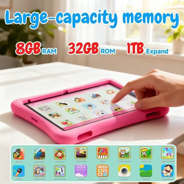 Kid 10 inch Tablet 10.1" Android 15.0, 8GB RAM, 32GB ROM, Expandable Storage, Dual Cameras & Long Battery Give your child the perfect blend of education and entertainment with our 10.1 -inch Kids Tablet! Preloaded with child-friendly apps, this tablet runs on Android 15.0 with 8GB (3+5 extended) RAM for smooth performance. The 32GB internal storage is expandable up to 1TB via a microSD card, so your little one never runs out of space for games, videos, and learning materials.