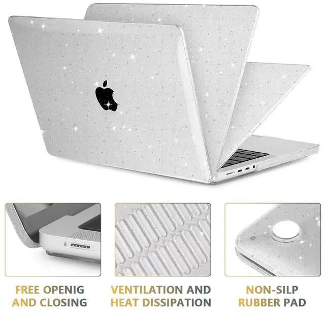 No cut out design and logo see through that makes your MacBook 16 out of the ordinary while keep the original design. ^^ [Two Separated Pieces Glitter Case, Snap on/Clip On Design] Top Cover and Bottom Cover Two pieces design, easy to clip onSnap on) and take off, let you open/close your MacBook freely all the time. Thunderbolt port access, also access to all ports without removing the case. Bottom cover with vent slots to heat dissipation and raised rubberized feet to keep your laptop firmly on the place. ^^ [4in1 Bundle