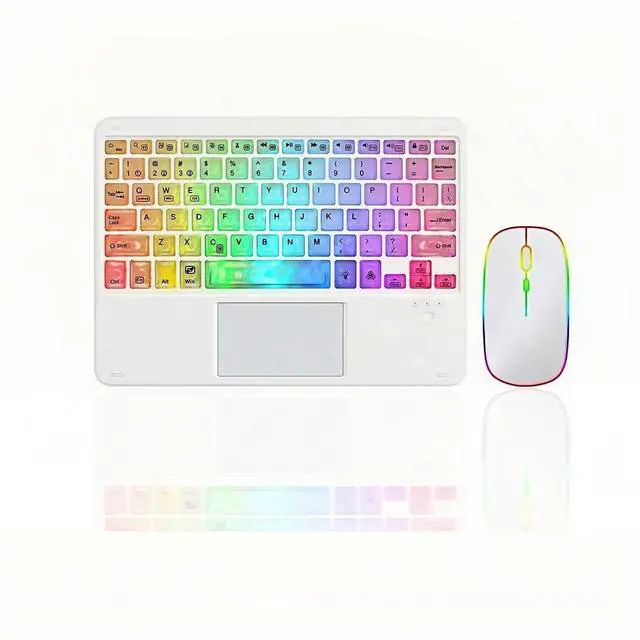 • 7-Color LED Backlit - This wiressless 7-color led backlit bluetooth keyboard and mouse adopts bluetooth wireless connection and scissor key structure,which bring you a perfect input experience,it has built in rechargeable polymeric lithium better and charging indicator,the keyboard will enter into sleeping mode if there is no action in 10 minutes,therefor it has a small comsumption and long battery life.