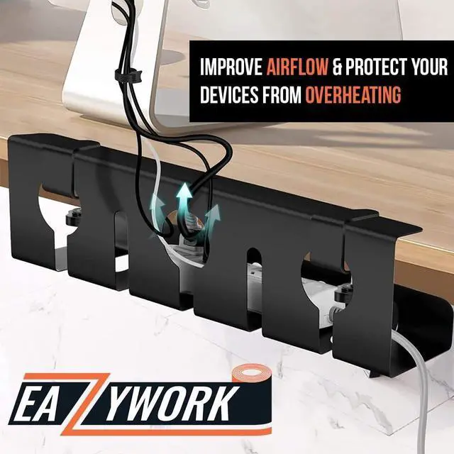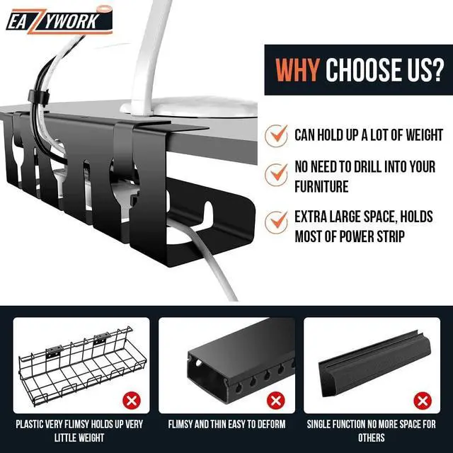 PROFESSIONAL: These under desk organizers prevent hazards and protect your cables from physical damage and wear. The EAZYWORK Cable Management Tray simplifies maintenance and gives your setup a neat, high end look, extending the life of your equipment. ^^ WIDER AND STURDY UNDER DESK CORD HOLDER: We are constantly improving the quality of our products to provide high quality services. To this end, we have increased the width of our under desk cord organizers to accommodate all types of extension cords, providing flexibility for future cable additions or modifications. This under desk cord management also allows easy access for maintenance, inspection, and upgrades. ^^