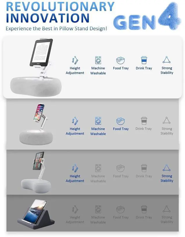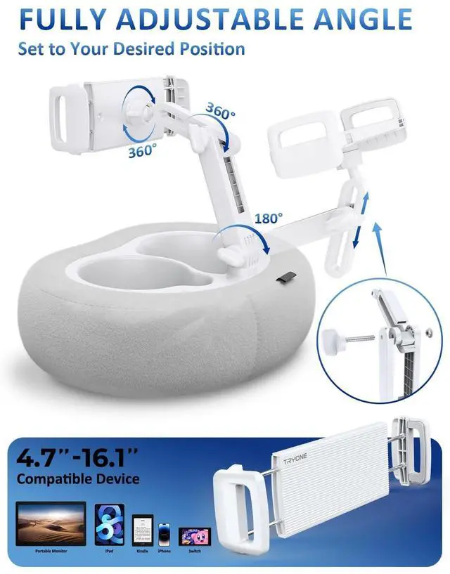 The two separate trays keep your snacks and drinks neatly organized, whether you're dividing food and beverages, separating dry and wet items, or reserving space for your phone and remote. Perfect for reading on your Kindle, binge-watching shows, or enjoying movies, this iPad pillow stand for lap ensures all your essentials are within easy reach ^^ Adjustable, Stable, and Secure Featuring a high-strength ABS adjustable rod and two easy-to-use knobs, this Kindle pillow stand allows you to set your device at any desired angle for reading in bed. Once locked in place, it stays firmly fixed, ensuring your tablet or Kindle wont slip or topple.