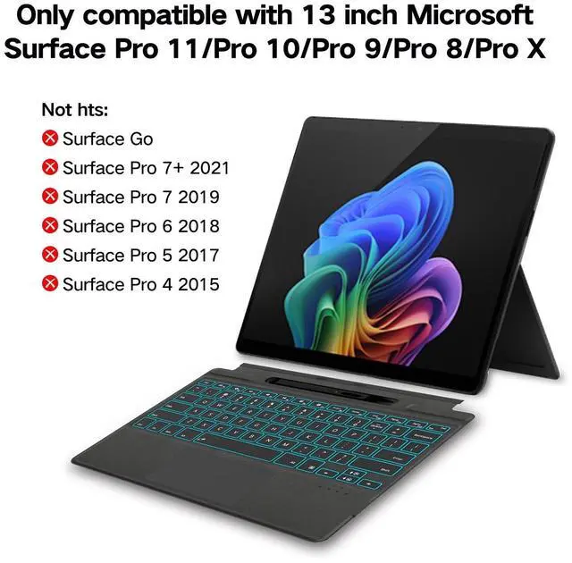 Compatibility : Specifically designed for Microsoft Surface Pro 11(2024), Surface Pro 10(2024), Surface Pro 9(2022), Surface Pro 82021and Surface Pro X (1st/2nd/3rd generation) 13 inch tablet, this surface pro 11 / 10 / 9 / 8 / x bluetooth keybaord with a large trackpad for precise navigation and control, 7 colors backlit for your choice, compact layout and quiet typing function, optimum key spacing for fast and accurate typing.All-new Jvkzaen surface slim pen features a thin, light profile. I