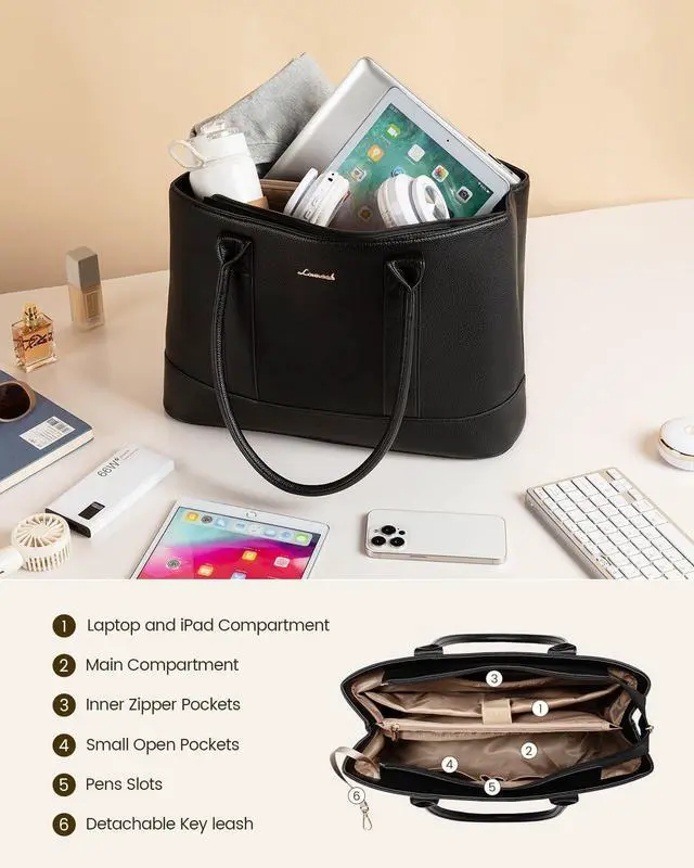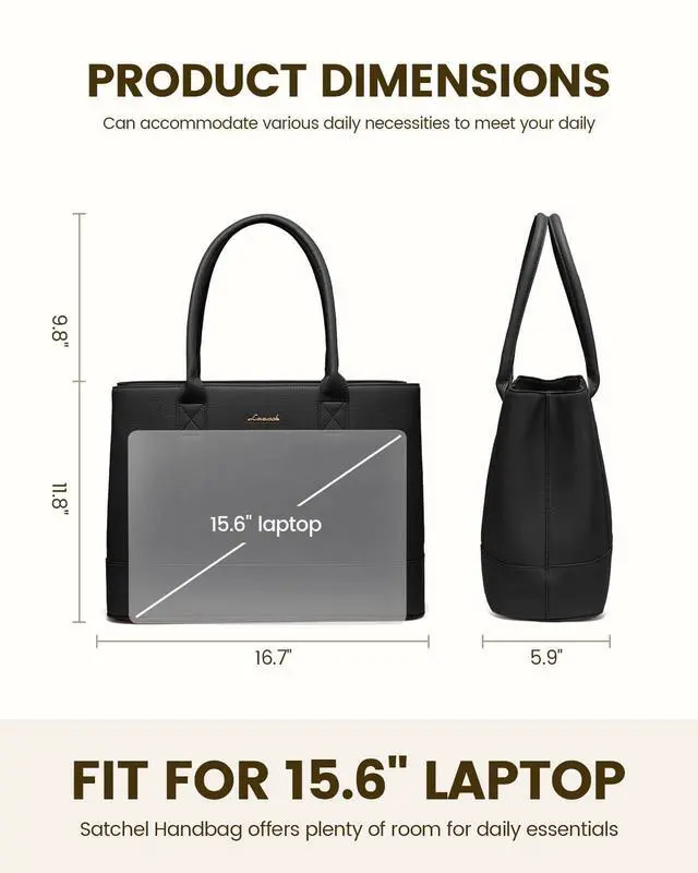 Stylish Elegance Matches Any StyleCrafted from waterproof, textured PU leather, this Laptop Tote Bag features a sleek silhouette and structured design, complemented by metal bases. Its high-quality construction and elegant appearance make it an ideal accessory for casual or formal outfit. ^^ Spacious & Organized for Daily EssentialsWith ample interior space, this Work Tote Bag has 2 compartments, 6 pockets. It effortlessly accommodates folders, phones, laptop, cosmetics, power banks, and other daily essentials, making it perfect for organized commuting. ^^ Secure Padding Laptop ProtectionThe thick, cushioned laptop compartment accommodates devices up to 15.6 inches, ensuring the Laptop Bag offers reliable protection.