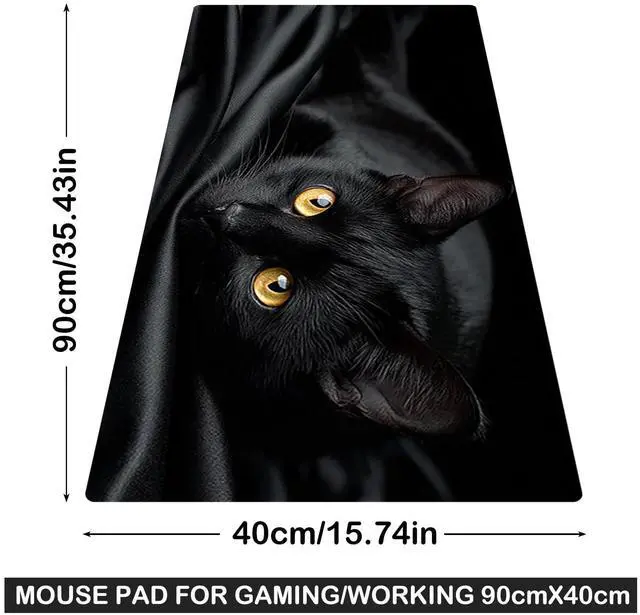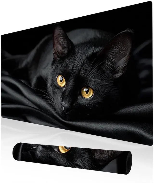 Features a mysterious black cat artwork, adding a sleek and enigmatic touch to your workspace while providing a large, smooth surface area for better mouse movement. ^^ Large size design ( 35.4 x 15.7 x 0.1IN ) offers ample space that fits both keyboard and mouse, ideal for cat lovers or those who prefer mysterious, dark aesthetics. ^^ Long - lasting anti - fray rugged stitching surrounds the mouse pad, enhancing durability to preserve the striking black cat design. ^^ Ultra - smooth surface, as sleek as the cats fur in the artwork, ensures exceptional tracking performance and aiming precision with optical and laser technology.