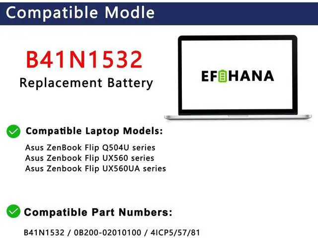 Capacity: 50Wh/3320mAh // 100% New from Manufacturer. Top circuit boards and smart chip ^^ Compatible Part NumberFit for B41N1532 / 0B20002010100 / 41CP5/57/81 ^^ Compatible with Laptop ModelsFit for Asus ZenBook Flip Q504U UX560 UX560UA series ^^ After ServiceReturn and exchange are permitted within 30 days, accompanied by a 12-month warranty.