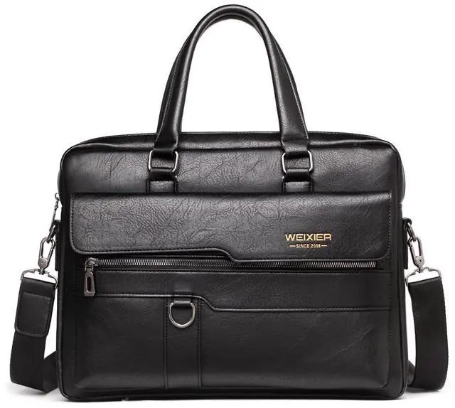 Weight: 900g approx; 1 main pocket (can fit 14 inch laptopinner with one interior zipper pocket and three open pocket ), 1 Back Zipper Pocket. 1 Front zipper pocket. The main pocket can fit a 14 inch laptop. Other spaces to put folders, books, keys, pens, phone, planners. Keep You Business Essentials Together and Well-organized in The Luxurious Leather Briefcase.
