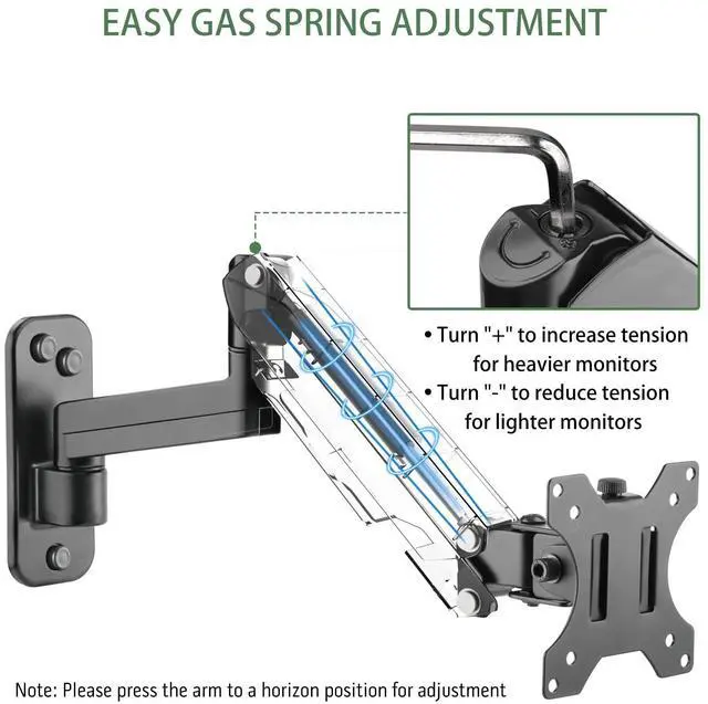 Please note: if there are no VESA holes in the back of your monitor, a VESA adapter is needed. ^^ [Advanced Gas Spring System] Constructed of high-grade steel, our computer monitor wall mount features premium gas spring system - after over 25, 000 exercise tests - bearing a max weight capacity of 17.6 pounds to securely hold your display. It is also height adjustable in a range of 11 inch to reach an optimal position while working or gaming. ^^ [Space Saving] Instead of being mounted on the desktop, this wall monitor mount will free up much valuable space on your workstation. When not in use, the arm can be retracted close to the wall of only 3". The integrated cable management system helps route wires/cords, creating a clutter-free and neat environment. ^^ [Customized Viewing Experience] The wall mount monitor arm features +90/-45 tilt, 180 swivel and 360 rotation from landscape to portrait mode. The arm can also be extended forward up to 20.5 inch, providing you a more flexible, comfortable viewing angle and helping relieve strain on your spine, neck, and shoulders.