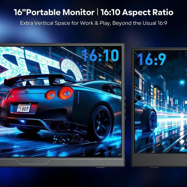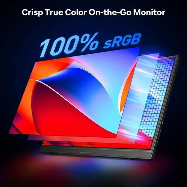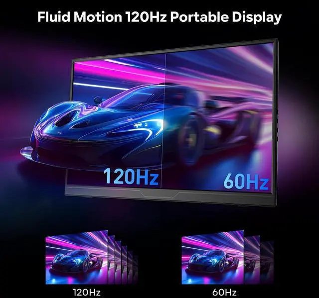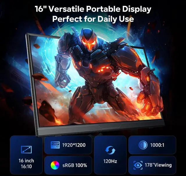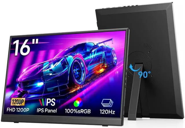 16" FHD 1200P HDR IPS DisplayThe Dopesplay portable monitor features a 16-inch 1200P IPS display that delivers crisp detail, vibrant colors, and natural contrast. Whether you're working, gaming, or streaming, this portable laptop monitor provides clear visuals and wide viewing angles for an immersive and comfortable experience. ^^ 120Hz Lightning-Fast GameplayThis portable gaming monitor delivers ultra-smooth visuals with a 120Hz refresh rate, enhancing the fast-paced gaming experience with smoother and more responsive gameplay, so you can hit your shots and react instantly. Game smoother, play smarter. ^^ Rotatable Built-in StandUnlike traditional displays, this portable laptop monitor comes with a rotatable stand that allows for free angle adjustment, seamlessly switching between landscape and portrait modes.