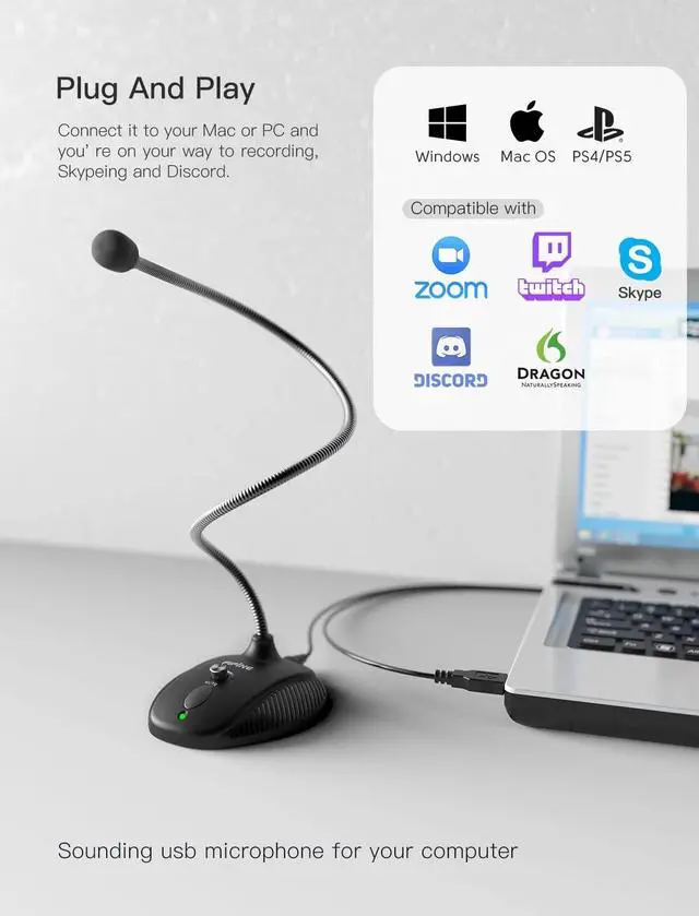 [Smooth Recording] Flexible gooseneck design allows you to adjust the USB microphone for PC to your level, and features a cardioid polar pattern that with tailored response for speech maximizes intelligibility in speech while reducing the chance for feedback. A suitable solution for meetings and presentation applications, improve people's ability to hear within the Zoom video conference software. ^^ [USB Plug&Play] The gooseneck provides up to 12" ( 32.5 cm) of length and easy-to-use microphone positioning. Connect the USB cardioid microphone to your laptop or PC via the USB connector and you're on your way to recording, chatting on Skype, Discord and meet all your computer-audio needs.