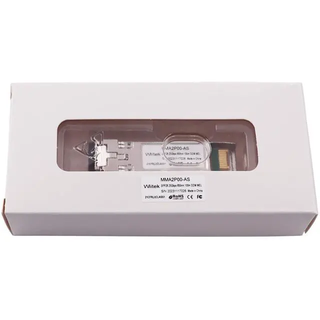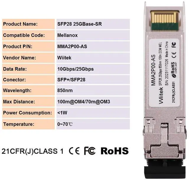 Wiitek 25G SFP28 SFP+ Optical Transceiver, 25GBase-SR Module, 850nm MMF, up to 100meters, Compatible for Mellanox MMA2P00-ASFeatures Compatible with CPRI option10 24.33G bps and 25GBASE 25.78G bps 100m transmission over OM4 MMF 70m transmission over OM3 MMF 850nm VCSEL laser transmitter 80nm high sensitivity PIN-TIA receiver SFP28 MSA compliant Built-in digital diagnostic functions Single + 3.3V power supply
