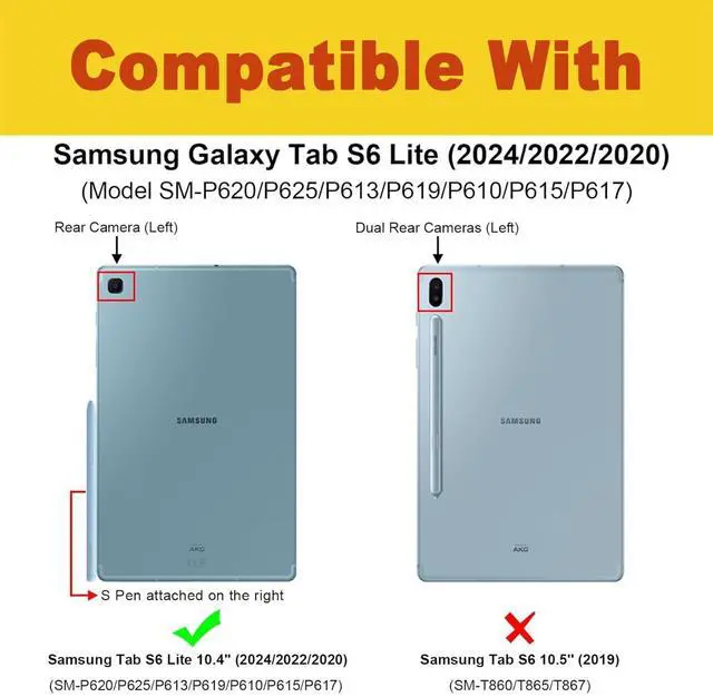 Perfect FitDesigned for Samsung Galaxy Tab S6 Lite 10.4 Inch 2024 Edition (Model SM-P620/P625) & 2022 Edition (Model SM-P613/P619) & 2020 Edition (Model SM-P610/P615/P617) Tablet. Please double check the model number before purchasing. ^^ Multifunctional Design 1. Built-in pen holder, easy to store the pencil, avoid falling while walking, the unique hole is easy to pull out the pencil, easy to use. 2. Adjustable Angles Fuction, supports horizontal & vertical angle, free your hands, securely to create a favorite direction for reading, viewing, typing, free your hands for other entertainments.