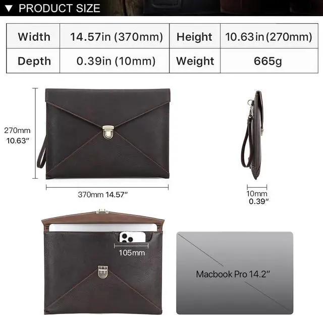 Slim Design: 10.63 x 14.57 x 0.39 inches, 270 x 370 x 10 mm, The Genuine Leather laptop bag for men are compatible with MacBook Pro 14.2 and most of 13"or 14" inch laptop ^^