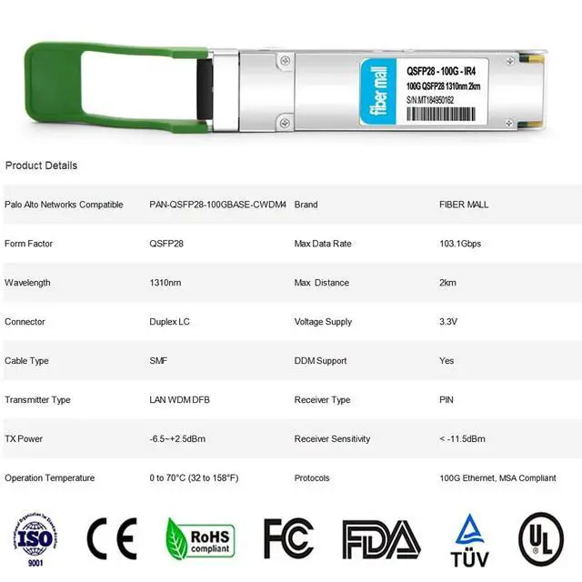 100GBASE CWDM4 IR4 QSFP28 transceiver module, 100Gbase, single mode, 1271nm, 1291nm, 1311nm and 1331nm, 2km, LC connector, full-duplex, Hot Pluggable, support DOM ^^ Power Consumption 3.5W enable Prolonged Service Life, Commercial Temperature Range 0 to 70C (32 to 158F) ^^ Support 100G to 4x25G Breakout Application. Hot Pluggable QSFP28 MSA and RoHS-6 Compliant to Maximize Uptime and Simplify Maintenance ^^ Protocols IEEE 802.3 ba, MSA Compliant QSFP28 MSA an100GBASE-CWDM4 and ITU-T G. 694.2 standard. ^^ Built-in Real Time Digital Optical Monitoring Capability for Strong Diagnostic Capabilities.