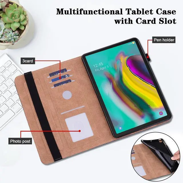 [Compatibility] The sm-t720 tablet case is designed for Samsung Galaxy Tab S5e 10.5 Inch Tablet Model (SM-T720/T725/T727) 2019 Release; Not compatible with any other devices, Please kindly check the model numbe in the back before purchasing. ^^ [Full Protection] The galaxy tab a9+ cover is made of PU leather and soft TPU back cover for providing full body protection against shocks, drops and scratches; Also samsung tablet s5e case comes with elastic hand strap that helps secure the front cover with the back shell. ^^ [Multiple Viewing Angles] The galaxy s5e tablet case with two anti-skid strips for allowing adjust your tablet to comfortable viewing or typing angles, humanized design.