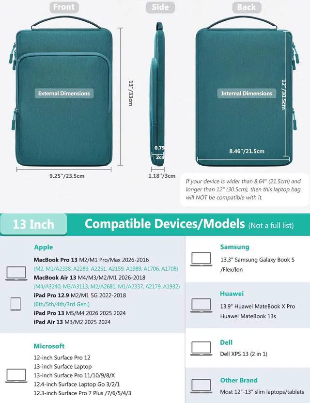 • Internal Dimensions: 12" x 8.46" x 0.79". Compatible with MacBook Air 13 M4/M3/M2/M1 2025-2018 (A3240, A3113, A2681, A2337, A2179, A1932), MacBook Pro 13 M2/M1 Pro/Max 2025-2016 (A2338, A2289, A2251, A2159, A1989, A1706, A1708), iPad Pro 13 M4 & iPad Air 13 M3/M2 2025 2024, iPad Pro 12.9 2022-2018, 13"-12.3" Surface Pro, 12.4" Surface Laptop Go, Dell XPS 13, 13.9" Huawei MateBook X Pro, Huawei MateBook 13s, 13.3" Samsung Galaxy Book S/Flex/Ion, and most 12"-13" slim laptops/tablets, etc.