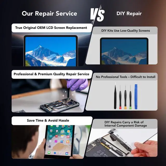 STEP 3: Wait patiently. Your Screen Repair will be finished by the 2-3 business day after we receive it. Afterwards it will be returned to you. Additionally, we offer a 30-day Coverage for non-artificial damage and non-water damage on screens we have repaired. ^^ Unique Screen Repair Service Pack From LW service pack, you will get free screen repair service. This service is designed to address the problem for the most people, who attempt to replace their screens themselves, but causing damage to their device. What's more, our expert repair team will assist in screen replacement and conduct a thorough maintenance check for your device. ^^ Advantages of LW Service Pack 1. Significantly less expensive than local phone repairing stores. 2. We repair your device with expertise and precision. Rest assured, we never access or factory-reset your data. Instead, we prioritize preserving your data and device settings. 3. Prevents customers from attempting DIY replacements of damaged devices and screens, avoiding financial losses. 4. We provide 100% ORIGINAL LCD SCREENS. 5. We have multiple color models for the iPad to choose.