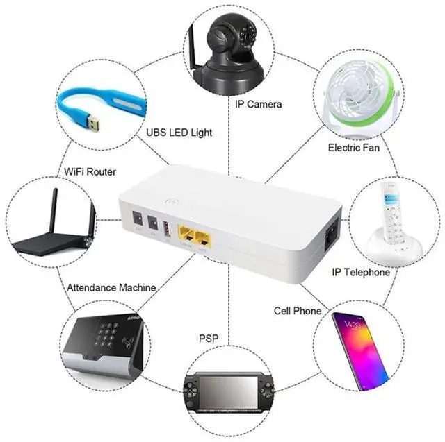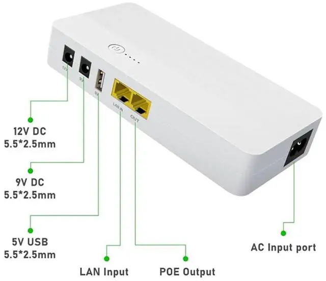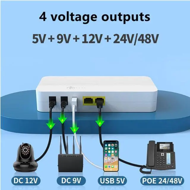 2024 Upgrade POE04 MINI UPS 8000mAh, 29.6WH POE04 mini ups supports 2*DC, 1*USB, 1*POE three output ports. DC supports 9V, 12 output, POE supports 24V output, the maximum current 1.5A, output power up to 14W. Internal structure is composed of 2*4000mAh 21700 cells, capacity of 29.6W h. POE interface can be connected to various gateway devices, keep the electricity and internet Small uninterruptible power supply for power outage, compatible with router, modem, security camera, smartphone, fax machine, fingerprint recorder, DSL, ect, and can still use the network in case of power outage