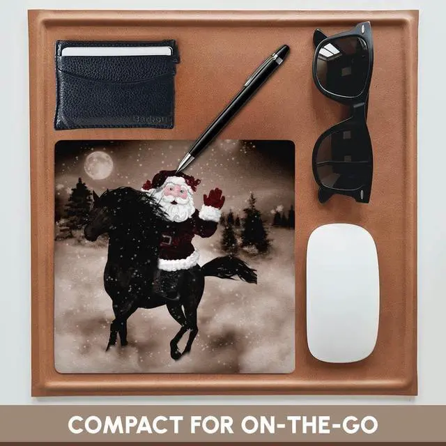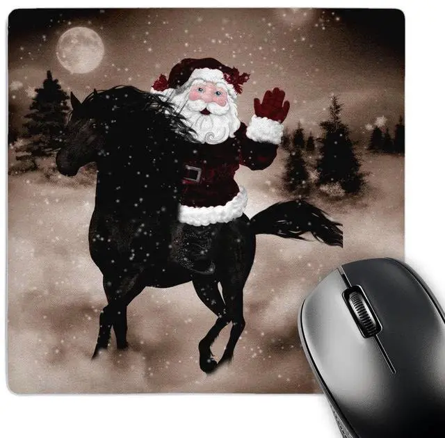 Western Themed Christmas Santa on a Horse in Burgundy and Sepia Hues Mouse Pad is 8" x 8" x. 25" and is made of heavy-duty recycled rubber. Matte finish image will not fade or peel. Machine washable using a mild detergent and air dry.