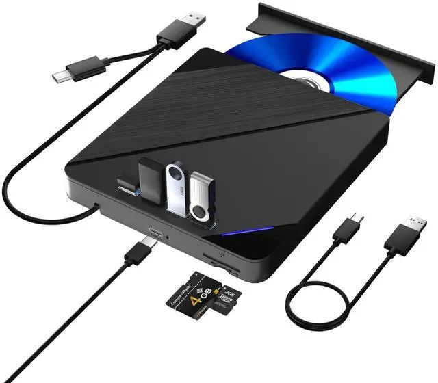 MULTIFUNCTIONAL CD DVD DRIVE: It has 1*SD card slot, 1*TF card slot, 1*Type-C portsFor charging, 4*USB solt and 1*2-in-1 cable (usb 3.0 +type-c) for data transfer. You can easily copy music, movies, and data files from SD cards, TF cards, or through the USB/Type-C ports to your computer. You can also transfer files from a player to an SD card, USB hard drive, or USB flash drive.