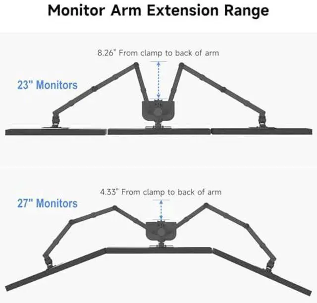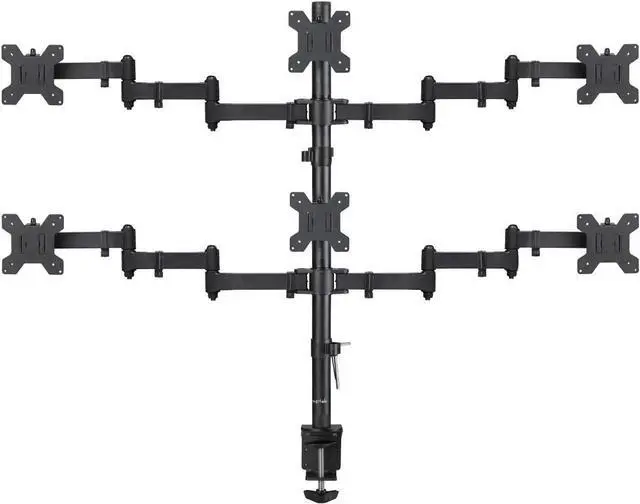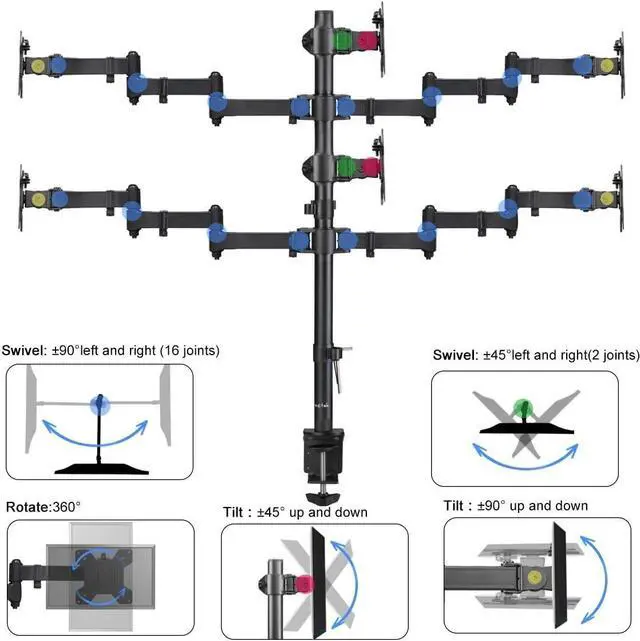 Compatibility - Hex monitor mount ideal for most screens up to 27" and 22lbs each with 75x75mm or 100x100mm backside mounting holes. ^^ Fully aticulation - Rotate 360, tilt 90 up and down, swivel 90 left and right (middle plates tilt 45 up and down, swivel 45 left and right), extra tall height adjustment along the center pole. ^^ Two install options - C-clamp and optional grommet base (fits desk up to 4" thickness) save your valuable desk space. ^^ Integrated cable management - Keeps your desk tidy and clean by organizing your power and AV cables in detachable cable clips.