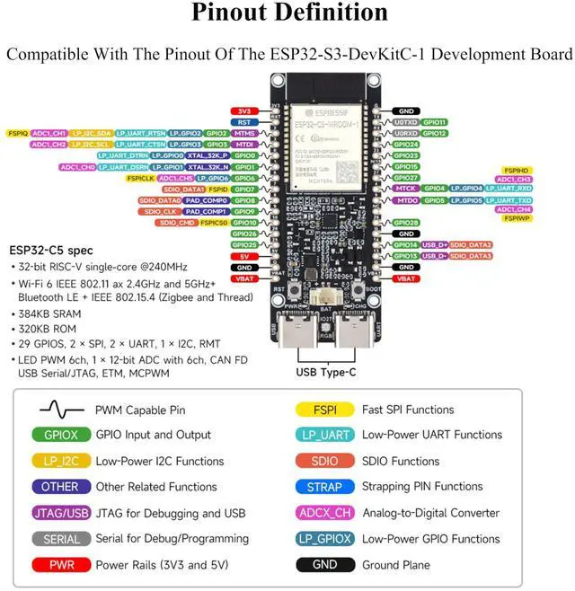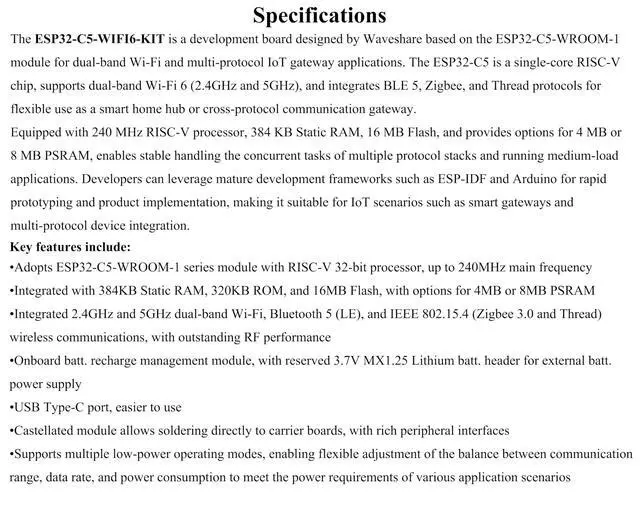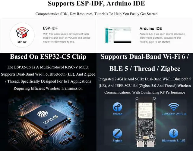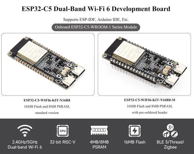The ESP32-C5-WIFI6-KIT is a development board (with Pre-Soldered Header) which is based on the ESP32-C5-WROOM-1 module for dual-band Wi-Fi and multi-protocol IoT gateway applications. ^^ Equipped with 240 MHz RISC-V processor, 384 KB Static RAM, 16 MB Flash, and provides options for 4 MB or 8 MB PS-RAM, enables stable handling the concurrent tasks of multiple protocol stacks and running medium-load applications. ^^ The ESP32-C5 is a single-core RISC-V chip, supports dual-band Wi-Fi 6 ( 2.4GH z and 5GHz), and integrates BLE 5, Zigbee, and Thread protocols for flexible use as a smart home hub or cross-protocol communication gateway.