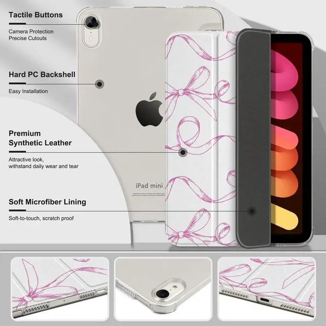 Generation 2021 (Model: A2567, A2568, A2569), this case offers a precise fit for the 8.3 -inch Liquid Retina Display. Please confirm your iPad model on the back of the device before purchase. It is not compatible with any other iPad models ^^ Magnetic protective cover automatically wakes iPad mini 7th/6th Gen when open and hibernates when closed to conserve power. Tri-fold stand provides the perfect viewing and typing angle ^^ The translucent frosted back cover lets you see the Apple icon in your favorite color, while the front cover combines a premium PU exterior, microfiber lining, and soft TPU for excellent scratch, impact, and drop protection to ensure long-lasting protection for iPad mini 7th/6th Gen ^^ Precise cutouts for all ports and buttons make it easy to access all the features of iPad without having to remove the case too often ^^ Ultra-thin design offers robust protection without adding unnecessary bulk, preserving your iPad sleek look and portability