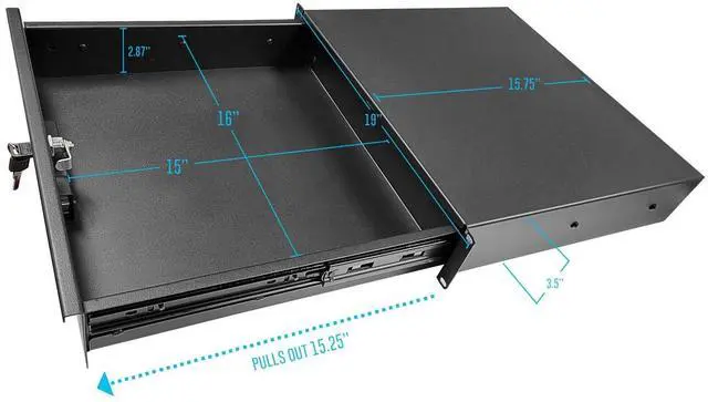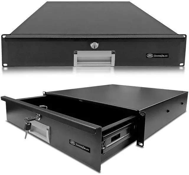 Heavy-duty 2U rackmount accessory drawer with lock and keys. 45lb weight capacity. Durable metal chassis and parts for road transportation. Smooth metal gliding runners. ^^ Easy mounting with four 5mm screws. Inside dimensions of this 2-space drawer are 16"W x 15"L x 2.87"D. Durable powder coat black finish. ^^ Each locking drawer comes with 2 set of keys. 15" deep interior allows you to keep organized. Good for storing laptops, microphones, electronics, and other valuable accessories. ^^ Ideal for open-frame server racks needing secured storage. Also works great as a DJ organizer, AV rack cable drawer, or DVD drawer for a home theater rack.