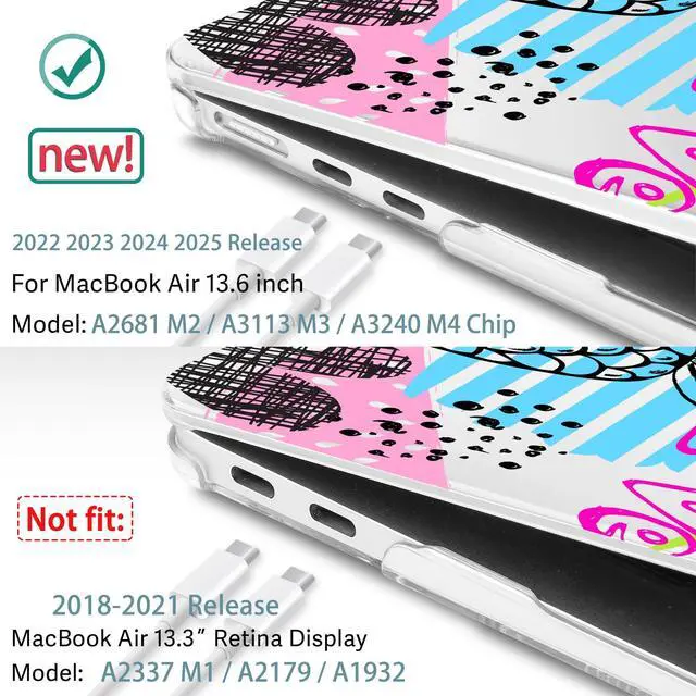 Compatible with: For MacBook Air 13.6 inch Model A2681 Apple M2 Chip with Liquid Retina display and Touch ID ( 2022 2023 Release ) For MacBook Air 13.6 inch Model A3113 Apple M3 Chip with Liquid Retina display and Touch ID ( 2024 Release ) For MacBook Air 13.6 inch Model A3114 Apple M4 Chip with Liquid Retina display and Touch ID ( 2025 Release ) Case Note