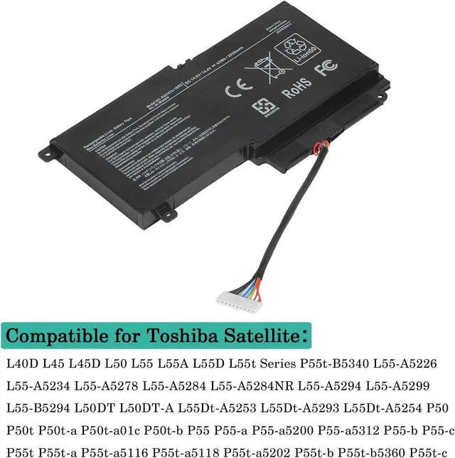 Cells: 4-cell; ^^ Compatible for Toshiba Satellite L40D L45 L45D L50 L55 L55A L55D L55t Series P55t-B5340 L55-A5226 L55-A5234 L55-A5278 L55-A5284 L55-A5284NR L55-A5294 L55-A5299 L55-B5294 L50DT L50DT-A L55Dt-A5253 L55Dt-A5293 L55Dt-A5254 P50 P50t P50t-a P50t-a01c P50t-b P55 P55-a P55-a5200 P55-a5312 P55-b P55-c P55t P55t-a P55t-a5116 P55t-a5118 P55t-a5202 P55t-b P55t-b5360 P55t-c ^^ This Laptop Battery fits PA5107U-1BAS PA5107U PSKLNA-01Q00J YD021621U P000573230 P000573240;
