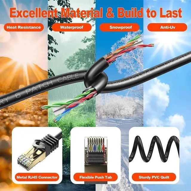 Outdoor Cat6 Patch Cables. Thanks to its rugged PVC jacket, It withstands low and high temperatures, dust, and dirt. CAT6 outdoor ethernet cable can easily cope with extreme weather such as sun, thunderstorm, blizzard, frost, and is suitable for soil, underground and dirt environments. ^^ Cat 6 Ethernet cablefor outdoor that efficiently conducts up to 10 Gbps and 550 MHz with less signal interferenceIncreases speed and decreases signal loss. ^^ Use an RJ45 connectorat the same level as the cable for a stable and interference-free Internet connection.