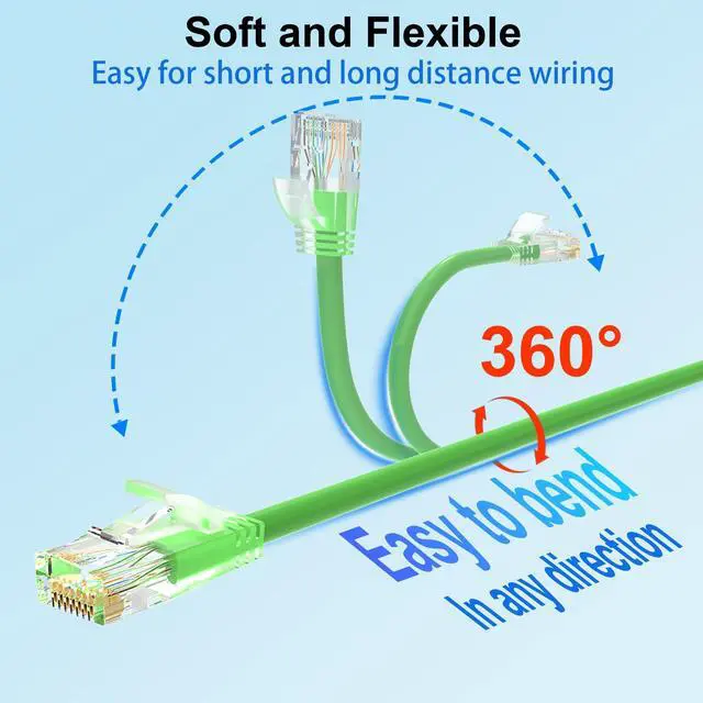 10G High-Speed PerformanceCat6a patch cable supporting up to 10Gbps speeds and 550MHz bandwidth for high-speed networks. Ethernet patch cable has excellent speeds and connectivity, fast transfer of streaming and data without loss. Cat6 patch cables perfect for home networking, office environments, and data centers gigabit network setup. ^^ Ultra Slim DesignSlim ethernet cable made of 28AWG pure copper. Slim cat6 patch cable is about 60% of standard ethernet cable thickness. Ultra-slim design make the cable to bend and stretch at will in tight spaces. The thickness of Cat 6 patch cable 2ft doesn't compromise the ability and provides reliable network transmission.