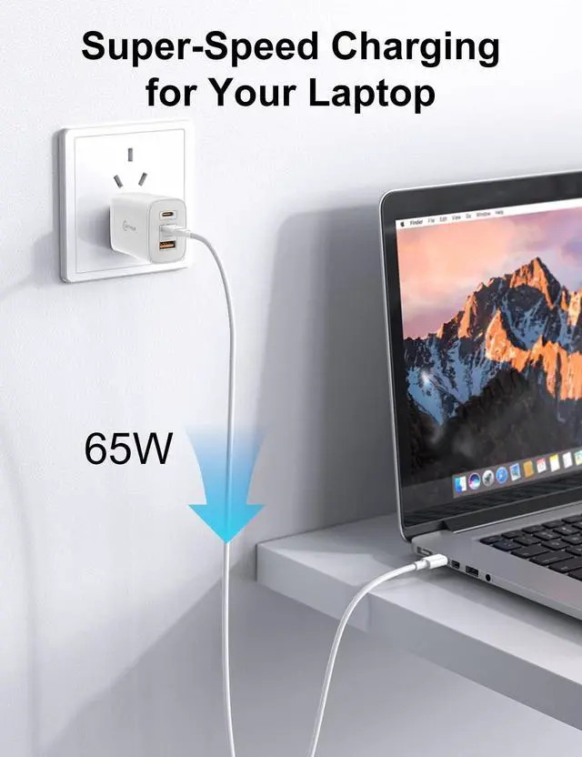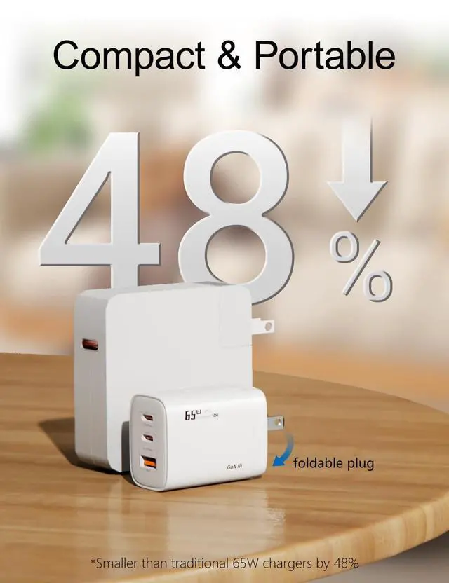 GaN III Chip & 65W High-Speed ChargingEquipped with advanced GaN 3 technology, our charger delivers faster, more efficient power with less heatfully compatible with MacBook Pro/Air, iPhone 17/16/15/14, Samsung, iPad, and more. ^^ 3-Ports Multi-Device SupportCharge up to three devices simultaneously with two USB-C and one USB-A ports. Power your phone, tablet, earbuds, and gaming device at once. ^^ Compact & PortableSmaller than traditional chargers by 48%, with a foldable plug design, this charging block is perfect for travel, work, or home use without bulk.