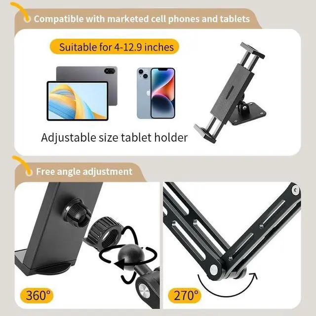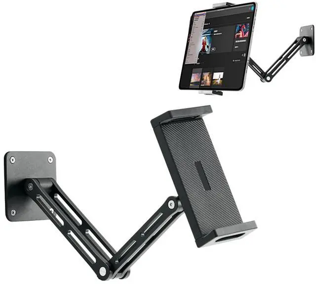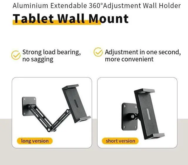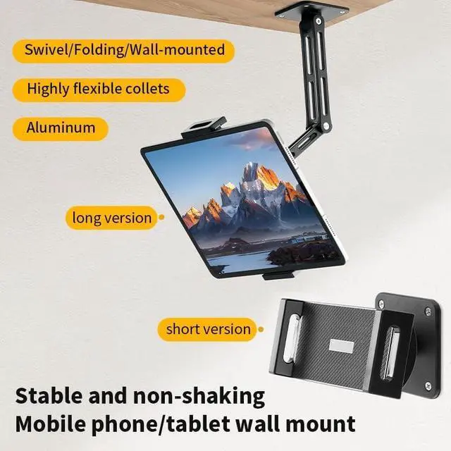 [Flexible adjustment]Wall mount adopts a foldable and extendable mechanical arm design, allowing for easy adjustment of the height and Angle of the tablet. Whether sitting, standing, or lying in bed, you can find a comfortable viewing Angle, meeting the needs of various scenarios such as watching TV series, video calls, and online learning. ^^ [Wide compatibility]The clamping part of the tablet wall mount can flexibly adjust the width and is compatible with most tablet devices of different sizes on the market. There is no need to worry about the problem of device model mismatch, providing you with a wider range of usage options.
