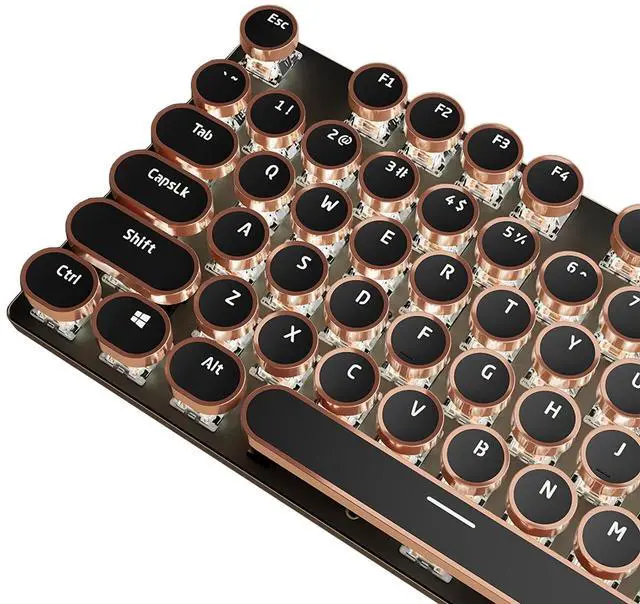 [Retro Typewriter Style with Mechanical Keys] - Vintage steampunk round keycaps with golden rings make this keyboard look like a classical typewriter. The custom white switches feature a smooth linear feeling and fast action with moderate resistance without a tactile bump feel. The sound is quiet when the button is pressed lightly. Combining an aesthetic retro look with advanced technology, this keyboard will give you a unique typing experience. ^^ [Elegant White LED Backlit] - This illuminated typewriter keyboard has 19 lighting effects. Press "Fn+Ins" to change the lighting effects. Press Fn+1~8 to choose the game backlight modes.