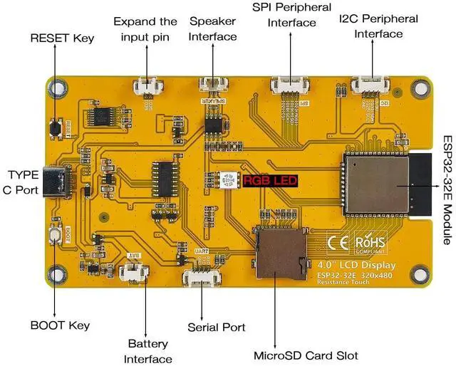 Product IntroductionComes with an ESP32-32E module, facilitating development and providing abundant development resources. Features a 4.0 -inch color screen with a 320x480 resolution, supporting up to 262K colors (RGB666) for a rich and vivid display. Offers multiple expansion interfaces, making it easy to connect various peripherals such as I2C, SPI, UART, and more. Supports external speakers for audio playback. Equipped with an RGB tricolor indicator light for versatile status indication. Includes a resistive touch screen for convenient human-machine interaction. Features a standard TYPE-C interface for easy program uploading and power supply.