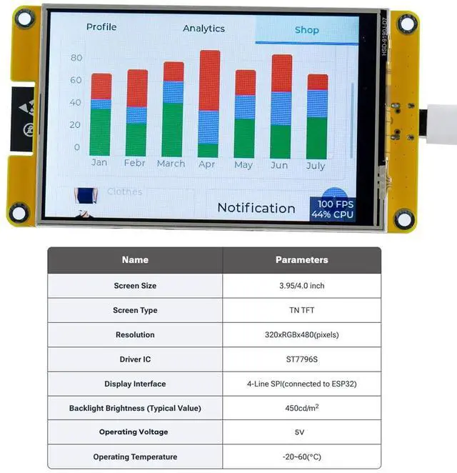 Built-in micro TF card slot for convenient storage expansion. Supports external lithium batteries, offering a lightweight and portable solution. Integrated battery charging management circuit ensures safe battery charging and discharging. Comes with a variety of example programs, making it easy to learn and get started. Offers low-level driver support with continuously updated online WIKI resources. ModuleESP32-32ECPUESP32-D0WD-V3, Xtensa dual-core 32-bit LX6 microprocessorMain Frequency240MHz (maximum) Storage448KB ROM + 520KB SRAM + 16KB RTC SRAM + 4MB external QSPI FlashWIFI 2.4GH z, 802.11 b/g/n modeBluetoothBluetooth V 4.2 BR/EDR and Bluetooth LE standardsDriver ICST7796SDisplay Interface4-Line SPI (connected to ESP32) Screen TypeTN TFTScreen Size 4.0 inchDimensions 60.88 (W) x 111.11 (H) x 5.65 (D) (mm)