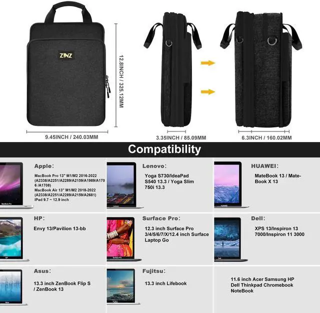 Case internal dimension: 12.2 x 8.86 x 3.15 / 5.91 inch. Perfect for MacBook Pro 13" M1 / Intel 2016-2021 (A2338/A2251/A2289/A2159/A1989/A1706 /A1708); MacBook Air 13" 2018-2021 (A2337/A2179/A1932); MacBook 12"; iPad 9.7" - 12.9"; Surface Pro 3/4/5/6/2017 12.3", Dell XPS 13 and 7"- 12.5" Dell HP Asus Acer Lenovo Xiaomi Samsung etc, most popular tablets, chromebooks. gifts for men women. ^^ Variable CapacitySlim and expandable design for flexible applications. The laptop crossbody bag owns two modes for commute and business trip, they are easy to transform between both. 5.3L, the slim mode for walking through both home and school or office as a laptop carrying case. 10.2L, the expanded mode of the large capacity to meet your traveling, cycling and casual. Ideal presents for family and friends as a handbag or shoulder bag. ^^ Professional ProtectionOne separate valuables compartment has 20 small compartments inside for passport, credit cards, cash, bank cards, smartphones and A4 size device. Other one separate laptop compartment with the three dimensional soft inner cushioning that is more 50% capability for bump and shock absorption than nomal laptop bag.