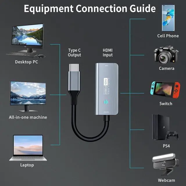 (NOTE: game live broadcast needs to be used with capture software, such as VLC, OBS, Amcap, etc. ) ^^ Wide CompatibleThis HDMI to USB C 3.0 capture card easily connects DSLR, camcorder, or action Cam, PS5/4, Smartphones, Switch, XBOX to your PC or Mac, compatible with Windows/Android/MacOS. ^^ Widely use4K HDMI Video capture card can capture video and audio simultaneously. This HDMI capture card is suitable for high definition acquisition, live broadcasts, conference rooms, video recording, teaching recording, medical imaging, game entertainment live broadcasting, etc. ^^ Package Content & Note 1 x HD Video Capture Card, 1 x USB 3.0 to USB C Adapter, 1 x English user manual. Please note that you need to restart the OBS Studio software after the audio setup is complete, otherwise it will result in no sound output. If you meet with any quality problems while using this product, please contact us, our customer service online 24 hours a day to solve your problems