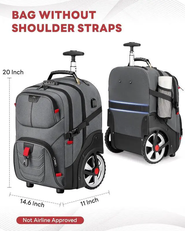 No Shoulder Straps: The rolling backpack features 7.1 inch oversized rubber wheels for smoother, steadier movement, even climbing on stairs. The hidden telescopic rod adjusts up to 40 inches for easy maneuvering. Roller bag without shoulder straps, there are two ways to carry it, a sturdy handle can be carried with one hand or the luggage strap on the back of the large carry on bag can be used to attach it to the suitcase ^^ Spacious and
