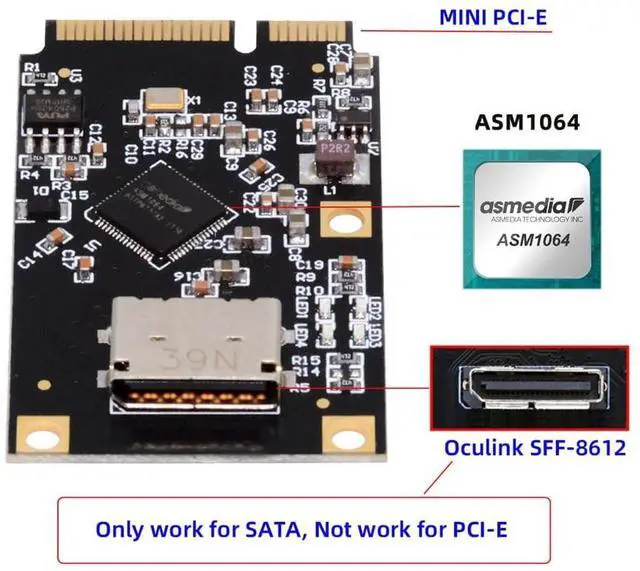 (The oculink to 4 SATA not include. ) ^^ Supports native command queue (NEQ). Under high load, NCQ technology can guarantee the performance and stability of the hard disk. ^^ Mini PCI-E PCI Express to Oculink SFF-8612 SFF-8611 SATA 3.0 Four Ports Adapter Converter 6Gbps Disk Extension Card for SSD