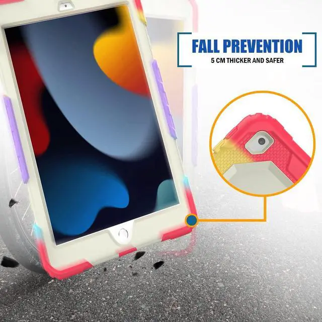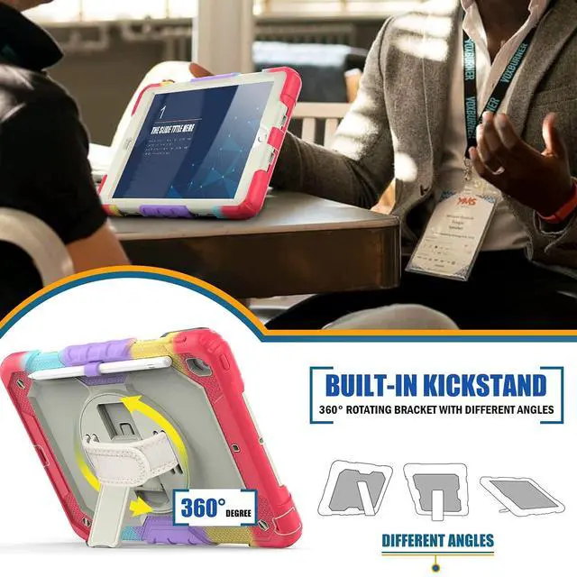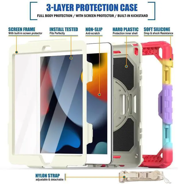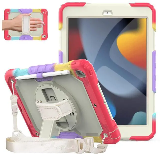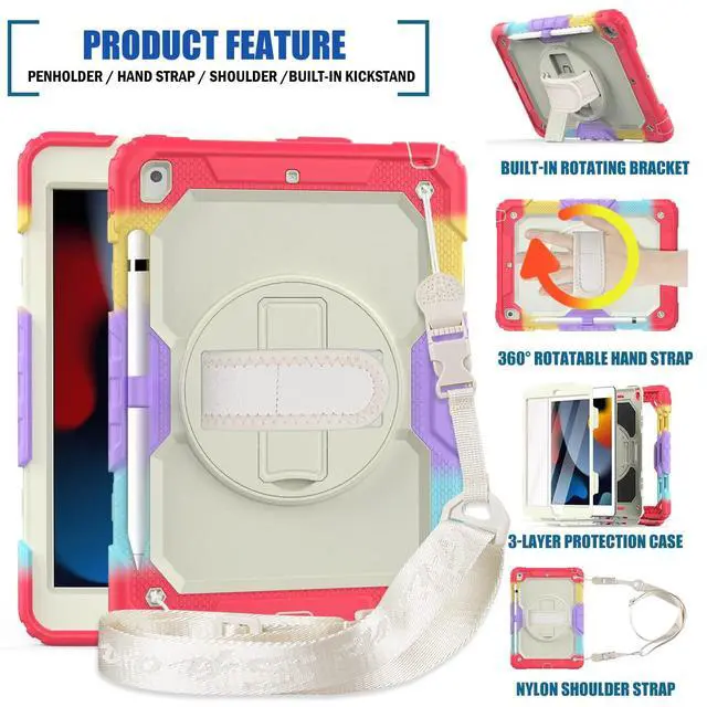 Shockproof case with screen protector designed for New iPad 9th/8th/7th generation 10.2 inch 2021/2020/2019 released. Please confirm the product model before purchasing. ^^ Heavy duty full body protects your iPad from accidental drop damage and wear. Inner hard polycarbonate with external soft silicone cushion coating to offer max protection and optimum comfortable grip. ^^ Precise cut and design easily full access to all ports, built-in screen protector with protection from scratches, keep dust and debris out. ^^ 360rotatable built-in kickstand and adjustable hand strap & adjustable shoulder strap for multiple possibilities, an extension strap is placed on the back to place your apple pencil.