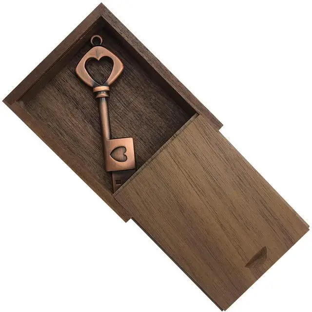 Vintage Look: Retro metal heart key shaped USB drive with walnut gift box. It's a perfect gift for birthday, anniversary, wedding or for photographers to send to their customers. Its has A strong zinc alloy shell and the size is 3"*1"* 0.28" and the gift box's size is 3.15" * 2.56" * 0.98". ^^ USB 3.0